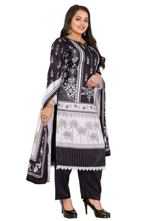 ICF Women's Silk Blend Black & White Printed & Embroidered Kurti with Pant & Dupatta Set