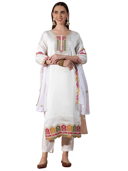 ICF Women’s White Vertigan Embroidered Kurta Set with Georgette Dupatta