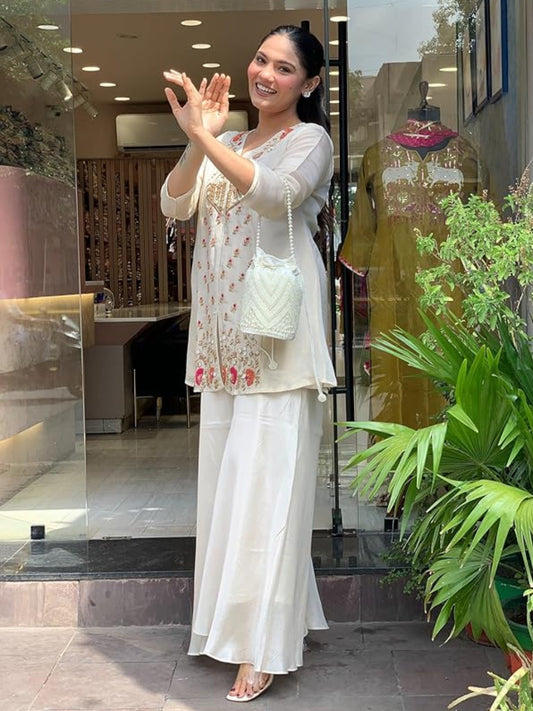 WT Women's Fully Stitched Heavy Chinon Silk Top & Plazzo Set with Embroidered Dupatta