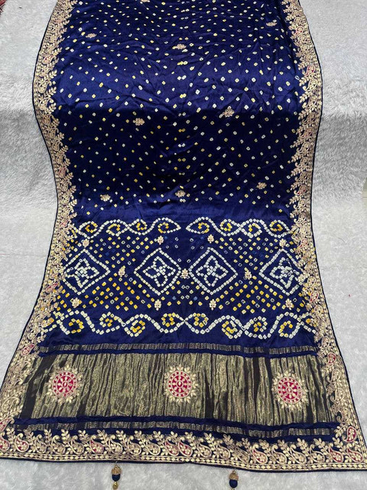 Traditional Styles: Often features bold, vibrant colors and traditional motifs. Gharchola Bandhani (a checkered pattern) is a classic bridal style often made on Gajji silk.