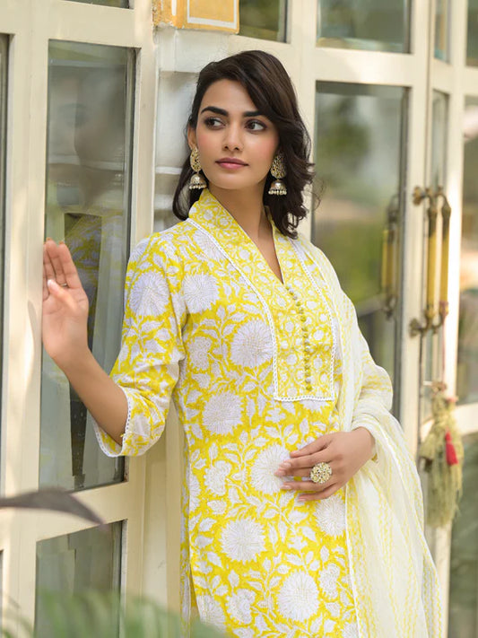 Divena Yellow Hand Block Print Pure Cotton Straight Kurta Set