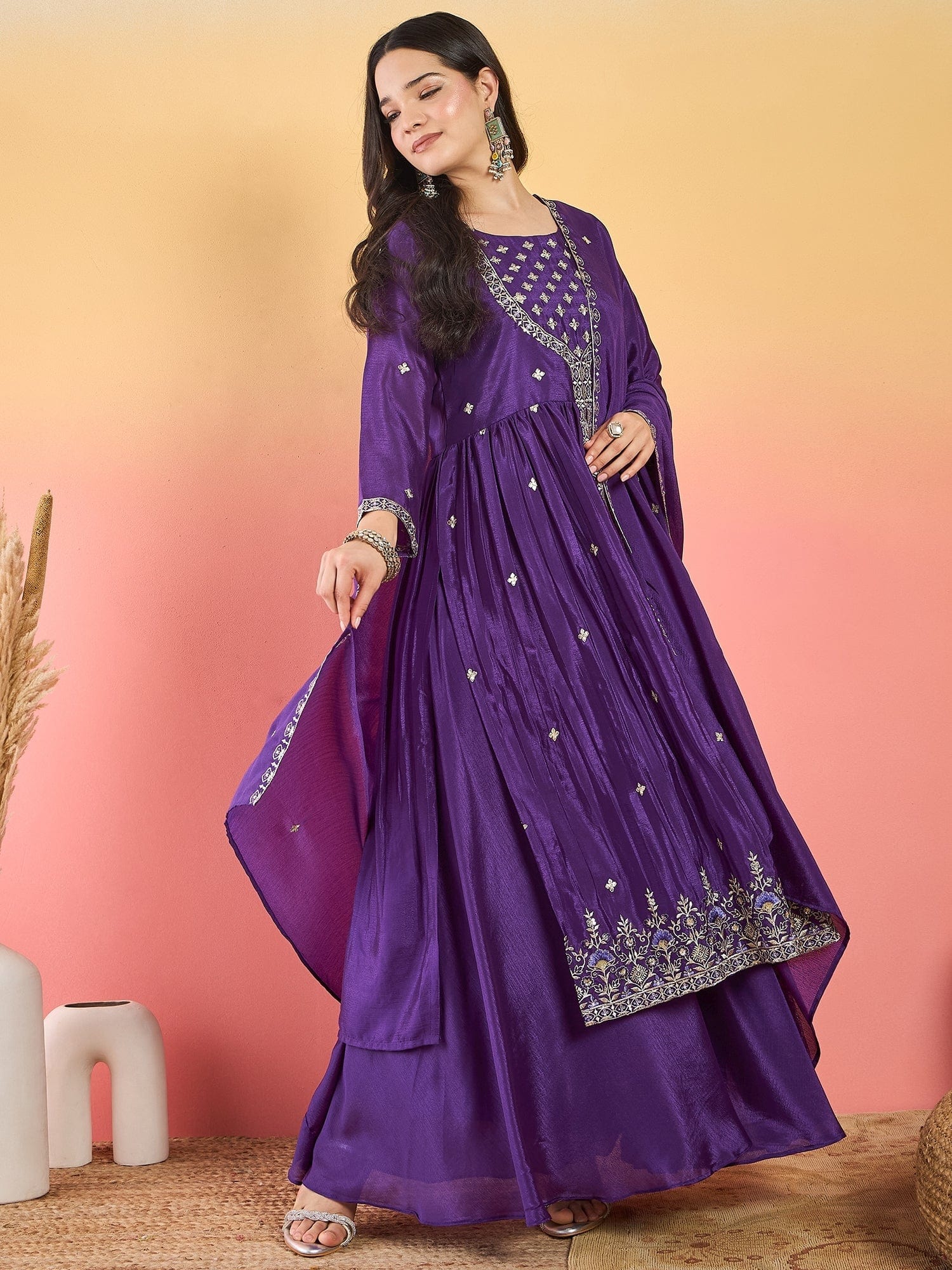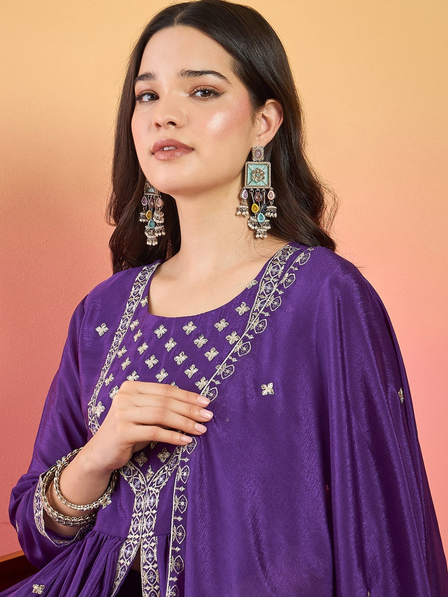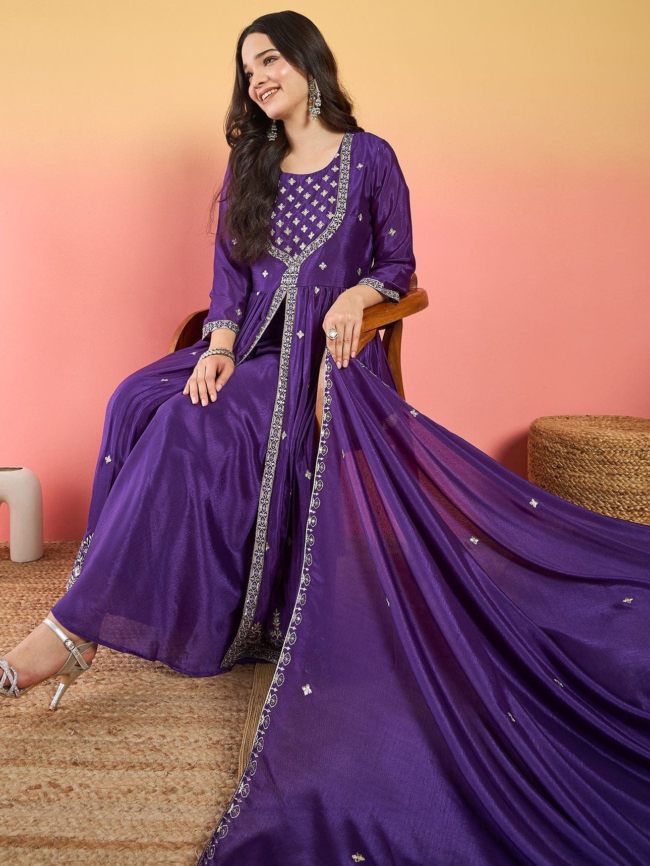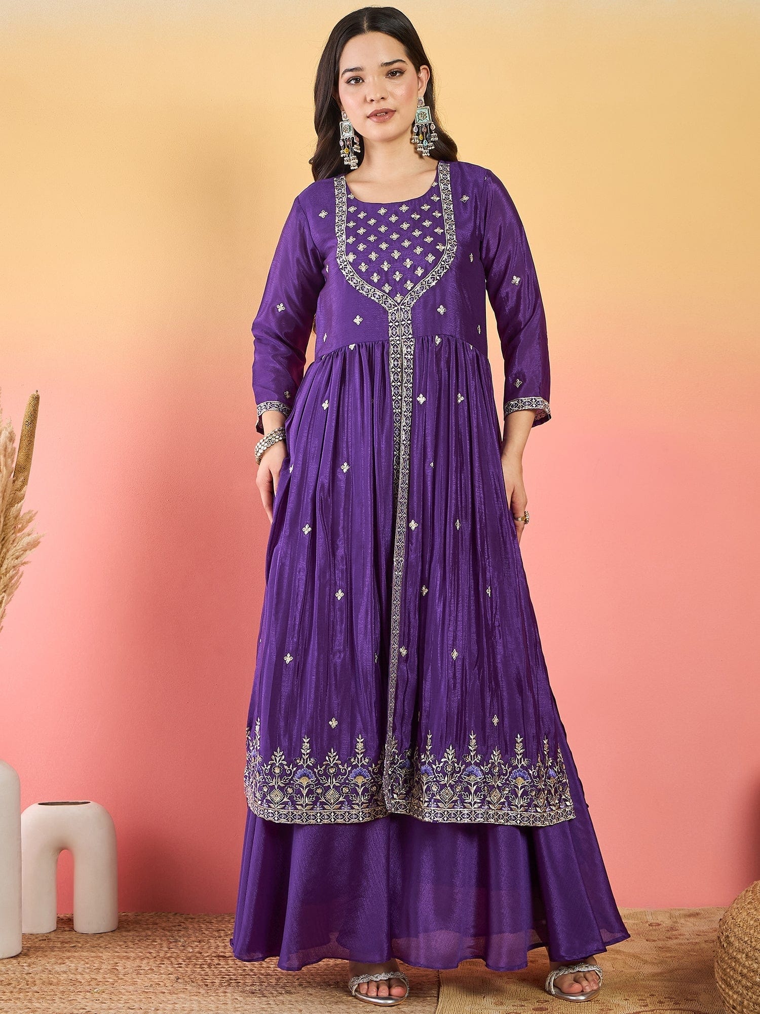 बैंगनी रंग का यह खूबसूरत सिल्क ब्लेंड कुर्ता सेट योक डिज़ाइन वाले कुर्ते , शरारा और कढ़ाई वाले दुपट्टे का बेहतरीन मेल है। पारंपरिक समारोहों के लिए एकदम उपयुक्त, यह तीन-पीस सेट आराम और पारंपरिक शैली का बेहतरीन मेल है। गोल नेकलाइन, 3/4 लंबाई की आस्तीन और स्लिप-ऑन शरारा इसे बेहद आरामदायक बनाते हैं। कपड़े की चमक और कढ़ाई को बरकरार रखने के लिए ड्राई क्लीनिंग की सलाह दी जाती है।
