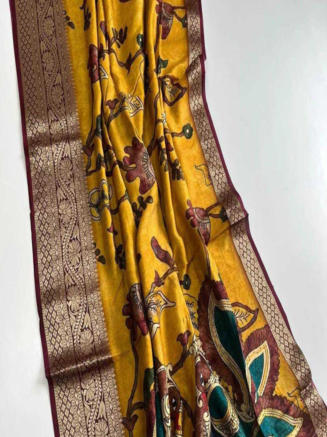 Elegant Dola Silk Blend saree featuring traditional Pichwai Kalamkari print throughout. Viscose contrast border with designed weave and unique Bandhani-detailed pallu add sophisticated flair. Includes matching printed blouse piece. Perfect for festive celebrations, weddings, and special occasions. Lightweight and lustrous fabric ensures comfort and grace. Dry clean only.