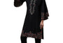 Elegant black kurta set featuring pure cotton construction with intricate embroidered detailing on the yoke. The straight-cut kurta showcases a V-neckline, three-quarter flared sleeves, and a knee-length hemline with back slit for ease of movement. Paired with elasticated trousers for comfortable all-day wear. Perfect for festive occasions and celebrations. Hand wash recommended.