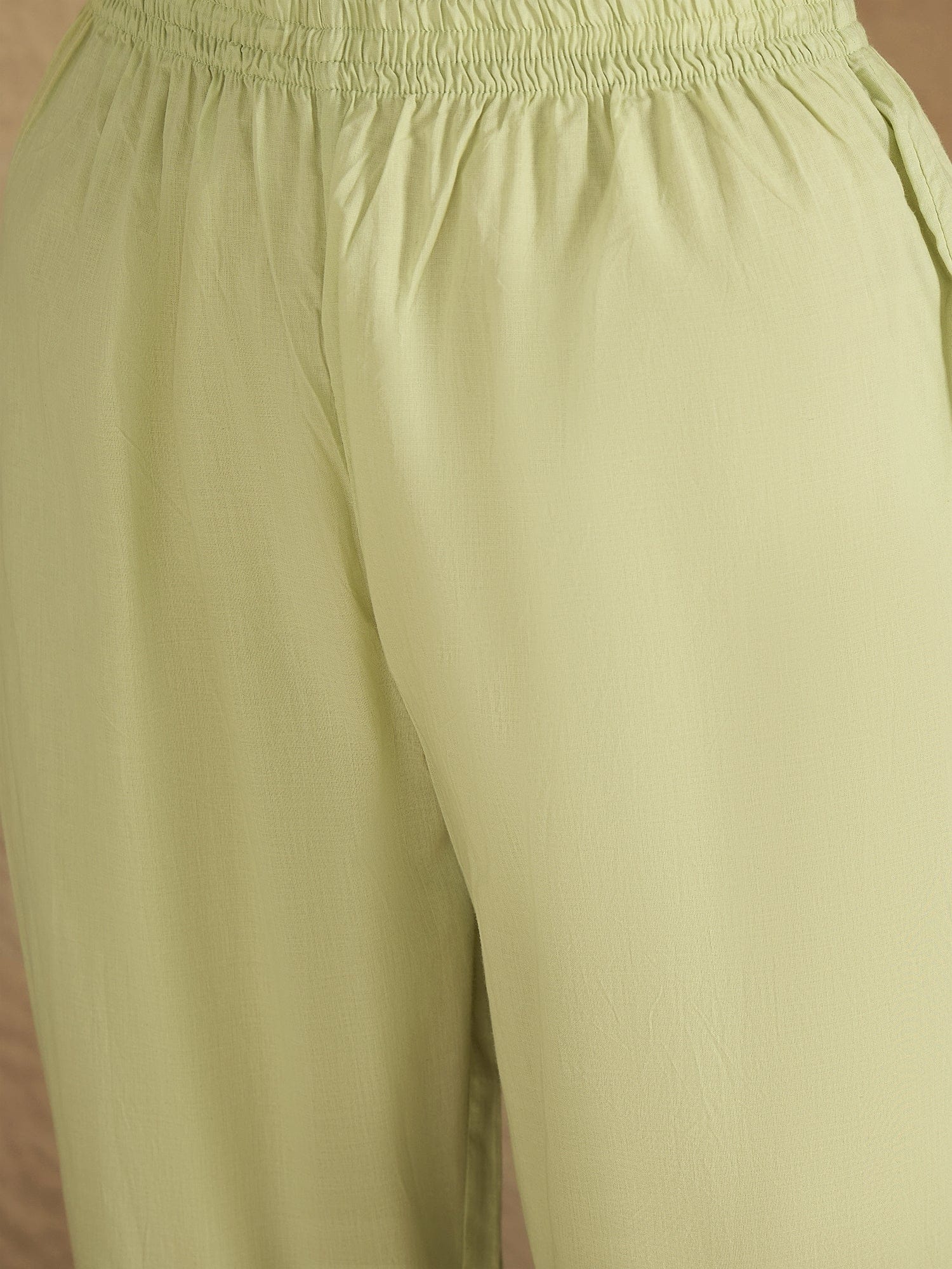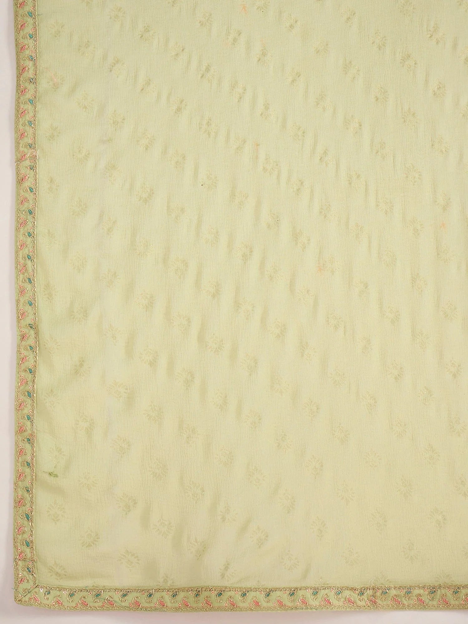This festive set features an orange and lime green Anarkali kurta with mirror and thread embroidery, and zari scalloped detailing. Made from pure cotton, the kurta has a flared, calf-length silhouette with a round neck and three-quarter sleeves. It pairs with printed cotton trousers that have an elasticated waist for comfort. The embroidered silk chiffon dupatta completes the look with delicate taping on the border. Ideal for special occasions, this outfit combines traditional motifs with breathable fabrics, offering both style and ease. Hand wash recommended for care.
