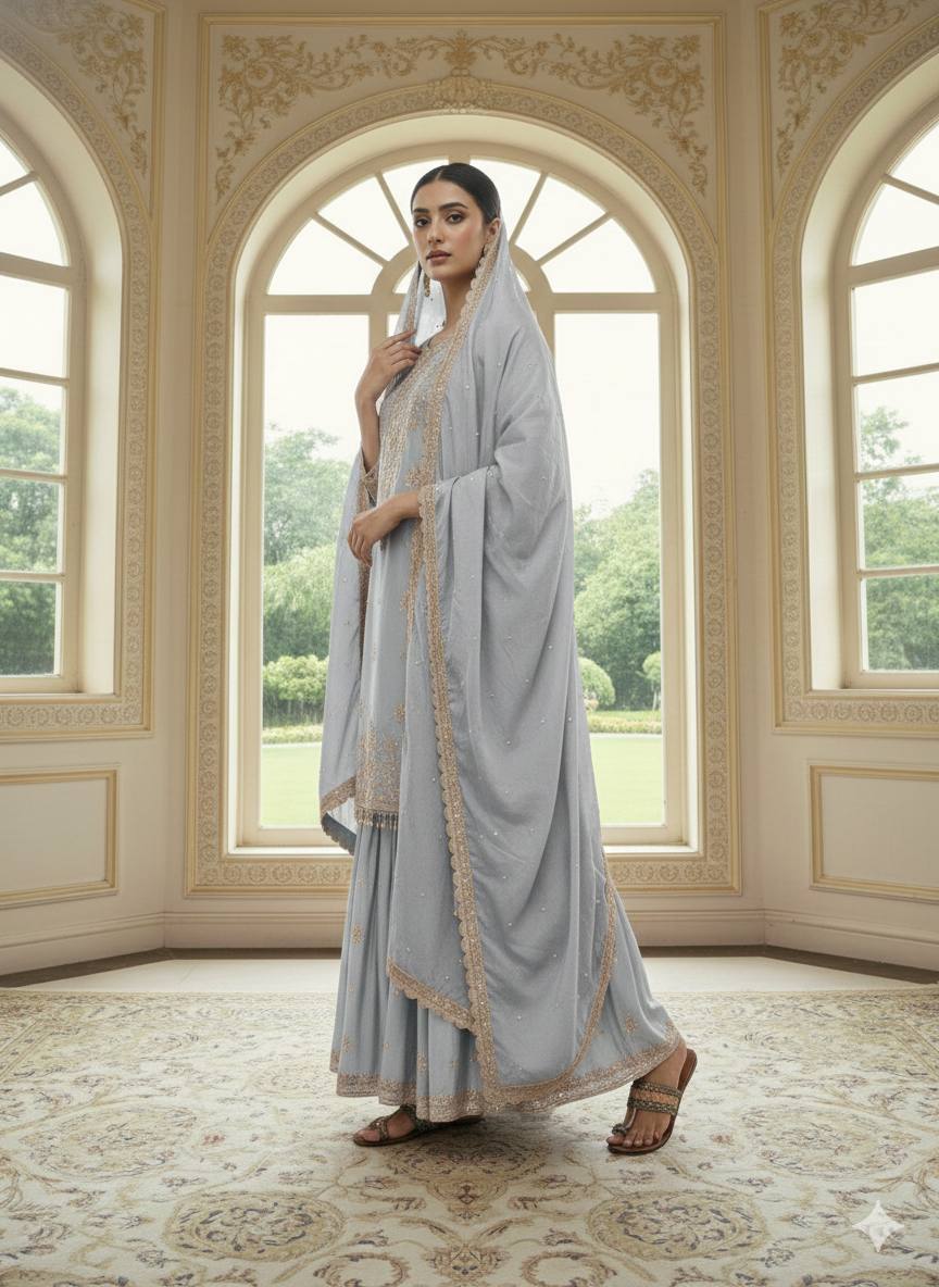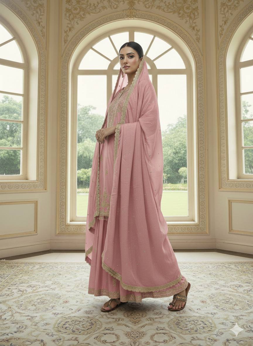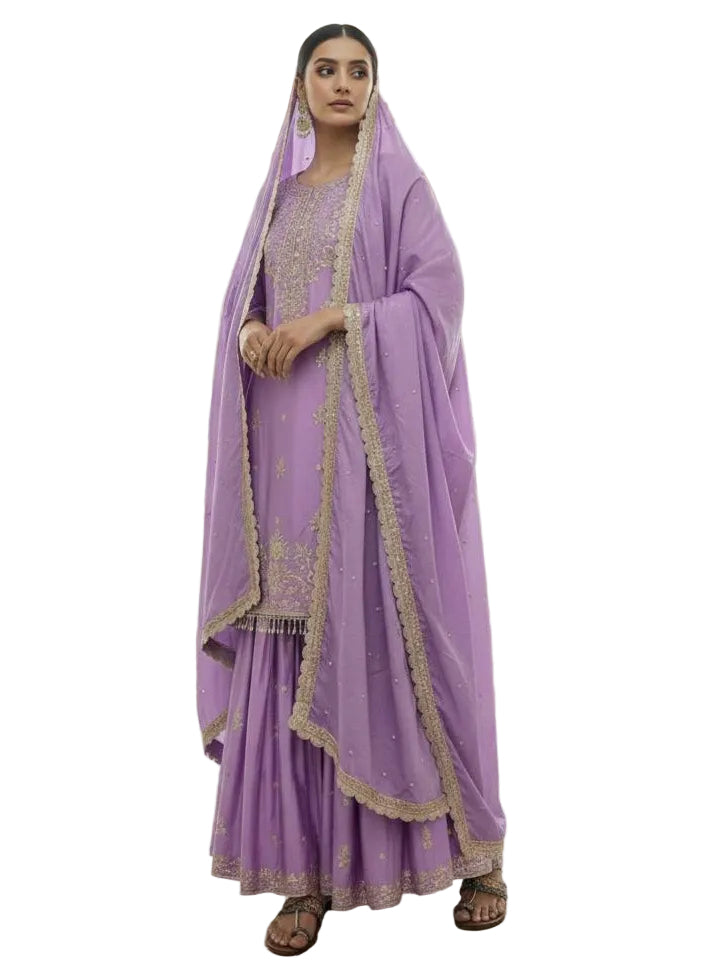 Luxurious Chinon silk with all-over 5mm sequin embroidery creates an elegant, eye-catching look. This ready-to-wear set includes a fully stitched top, palazzo pants, and heavy dupatta featuring pearl tassels, lace details, and cutwork borders. Soft micro cotton lining ensures comfort throughout the day. Available in sizes S to 3XL, with top length 39–40 inches and palazzo length 40–41 inches. Perfect for weddings, sangeet, receptions, and festive celebrations. Premium 900gm weight delivers a luxurious feel.