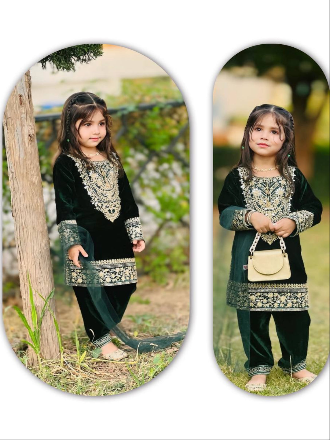 Elegant girls' 3-piece velvet ensemble in heavy viscose with sequin embroidery on the top and bottom. Features full sleeves, micro cotton lining, zipper closure, and a net dupatta with decorative tassels. Fully stitched and ready to wear for ages 3–15 years.