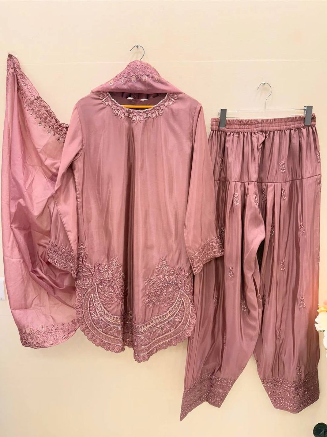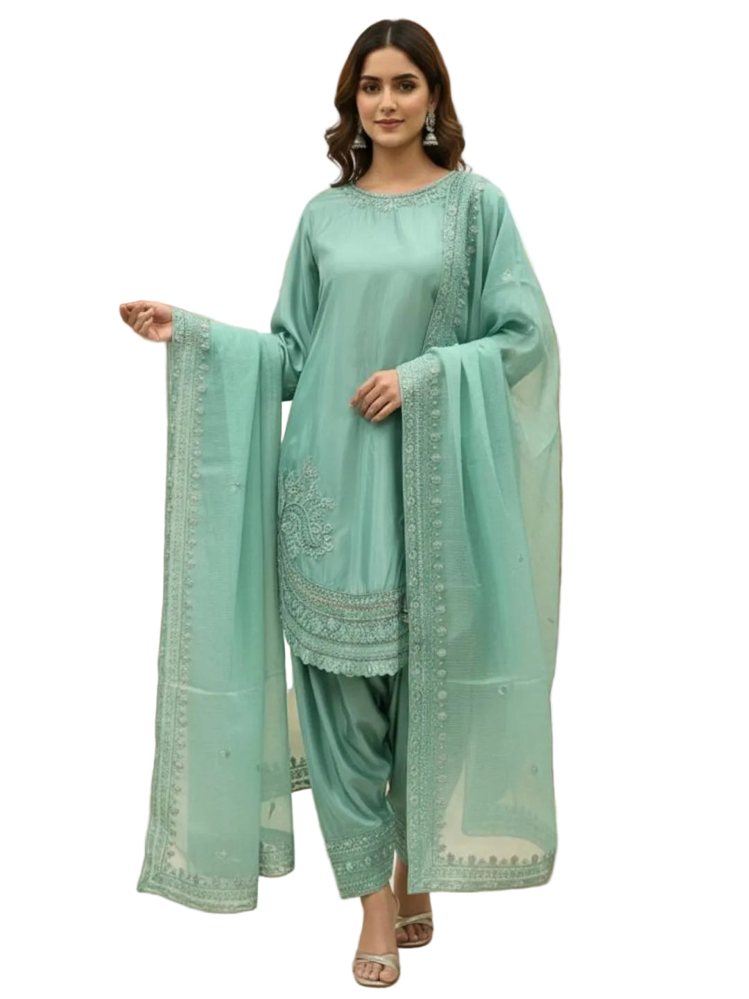 Stunning Farshi ensemble featuring a natural crepe top with intricate 3mm sequence and cutwork detailing. The wide-leg palazzo drapes gracefully with an elastic waistband, while the organza dupatta gleams with Swarovski-style diamonds. Fully stitched with comfortable micro cotton lining. Sizes M–XXL, weighing just 800g. Ideal for weddings and celebrations, this set balances opulent design with effortless wearability.