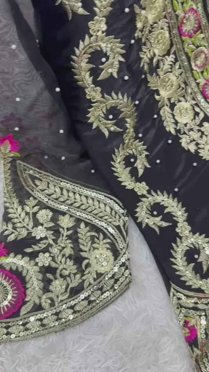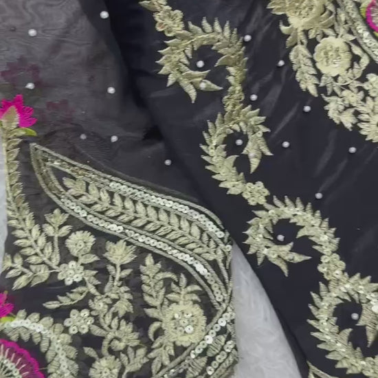 Premium GMY Silk three-piece set featuring an embroidered top with thread and sequin work, matching palazzo pants with elastic waist, and coordinating dupatta. All pieces crafted from pure GMY silk with heavy micro cotton lining for comfort. Available in sizes M to XXL. A luxurious, fully stitched ensemble perfect for special occasions.