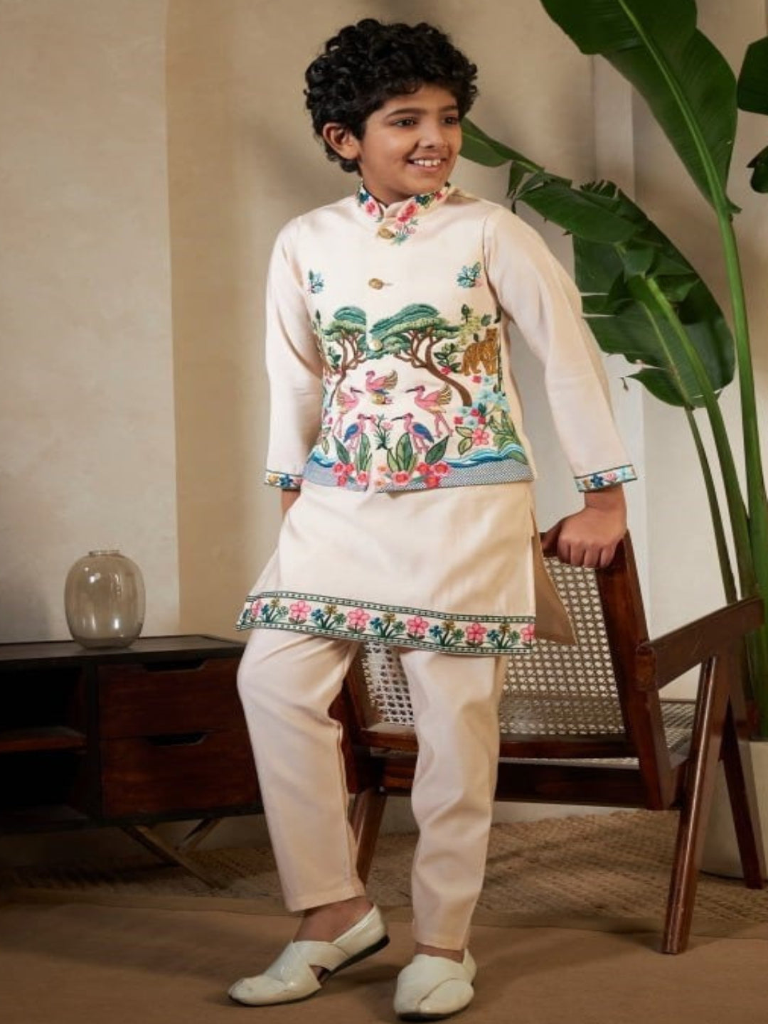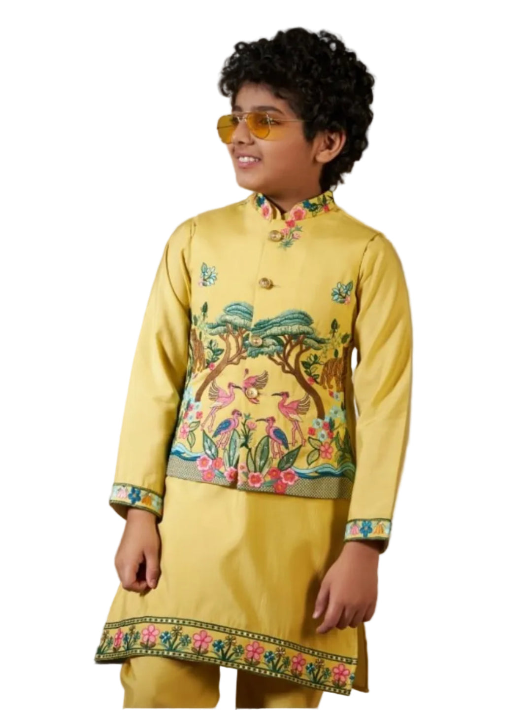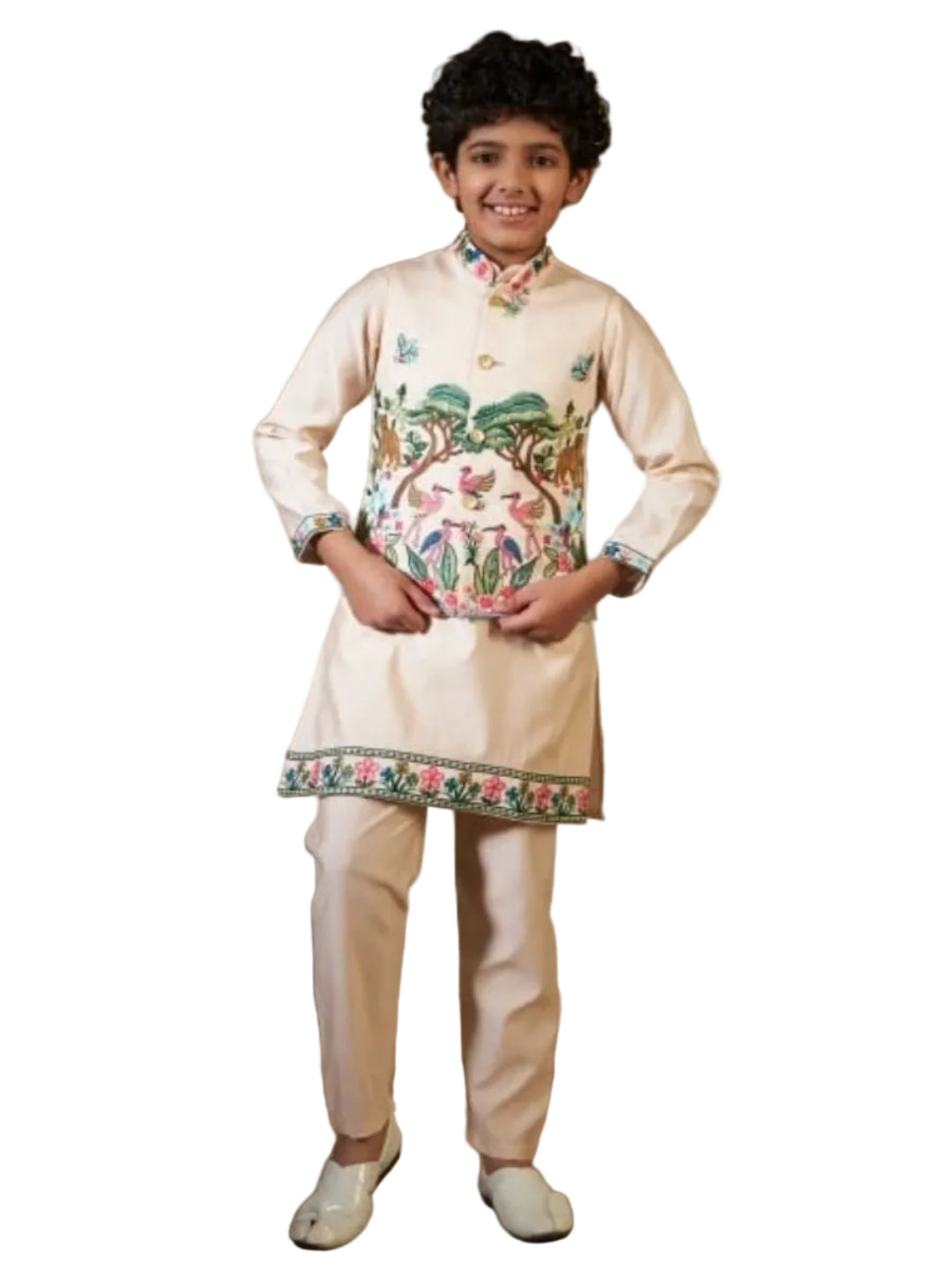 Complete 3-piece festive set for children ages 6-12, featuring a designer vest, kurta, and pants in premium viscose silk. Available in 5 exclusive colors with substantial 1kg fabric weight for durability. Hand wash or dry clean recommended. Refer to size guide (24-32) for proper fit by age.