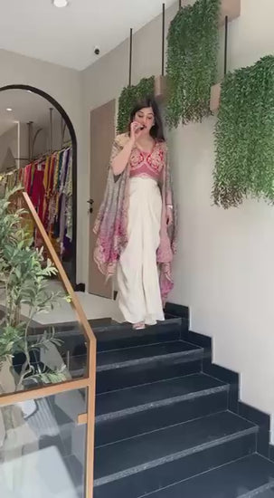 Elegant Indo-Western ensemble featuring a silk tube blouse with intricate cording and sequin embroidery, paired with a draped crape silk skirt and matching French crepe shrug. Perfect for weddings and special occasions. One size fits all with premium fabric construction throughout.