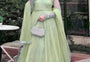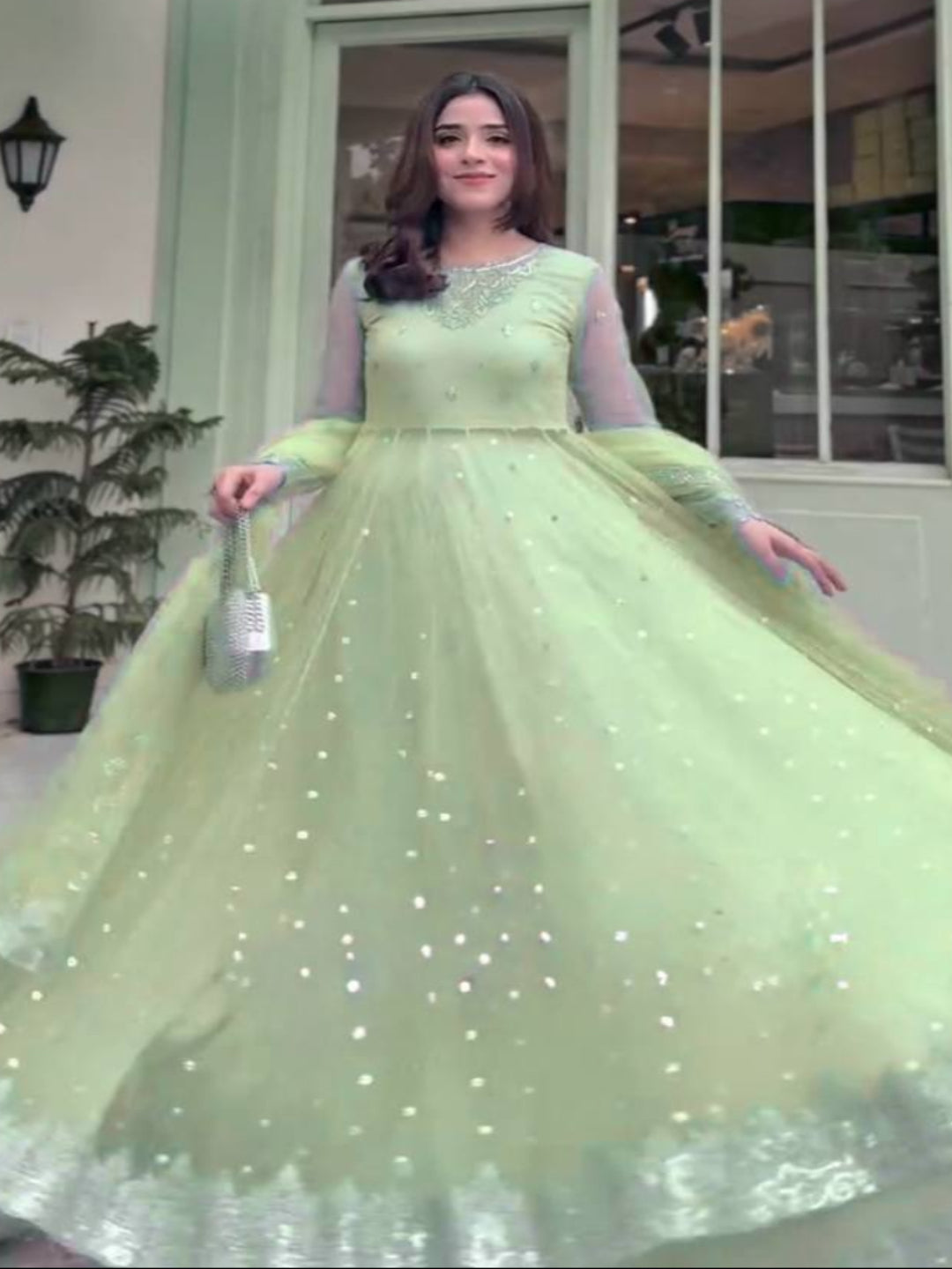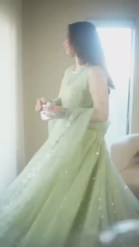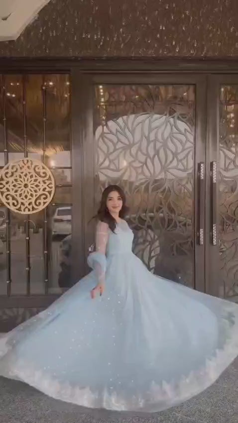 Elegant festive ensemble featuring a fully stitched faux georgette gown with intricate thread and sequence embroidery, paired with a matching lehenga and butterfly net dupatta. Soft micro cotton lining ensures comfort throughout wear. Available in sizes M to XXL with extended sizing options. Perfect for celebrations and special occasions.